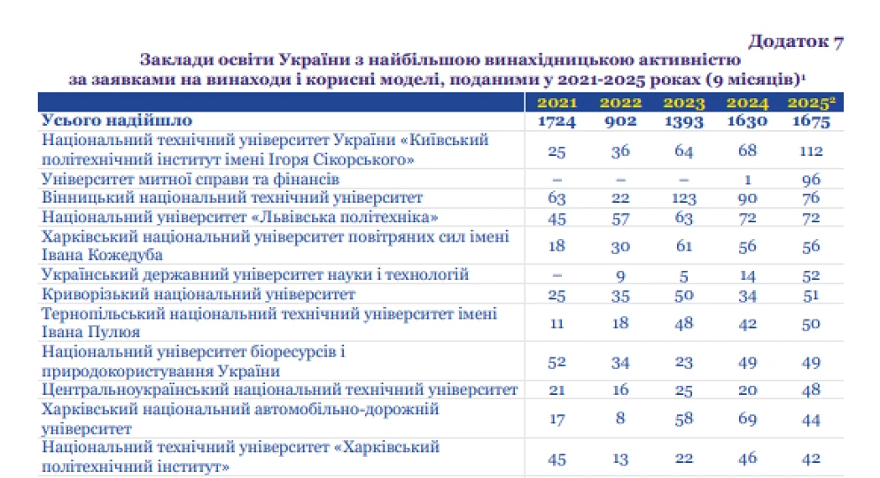За перші дев’ять місяців 2025 року науковцями та інноваторами ЦНТУ подано 48 заявок на винаходи та корисні моделі. Такий показник забезпечив університету 10-те місце серед закладів вищої освіти з найвищою винахідницькою активністю, що перебувають у сфері управління Міністерства освіти і науки України. При цьому підсумкові дані ще формуються, адже УКРНОІВІ готує офіційний бюлетень за результатами року.