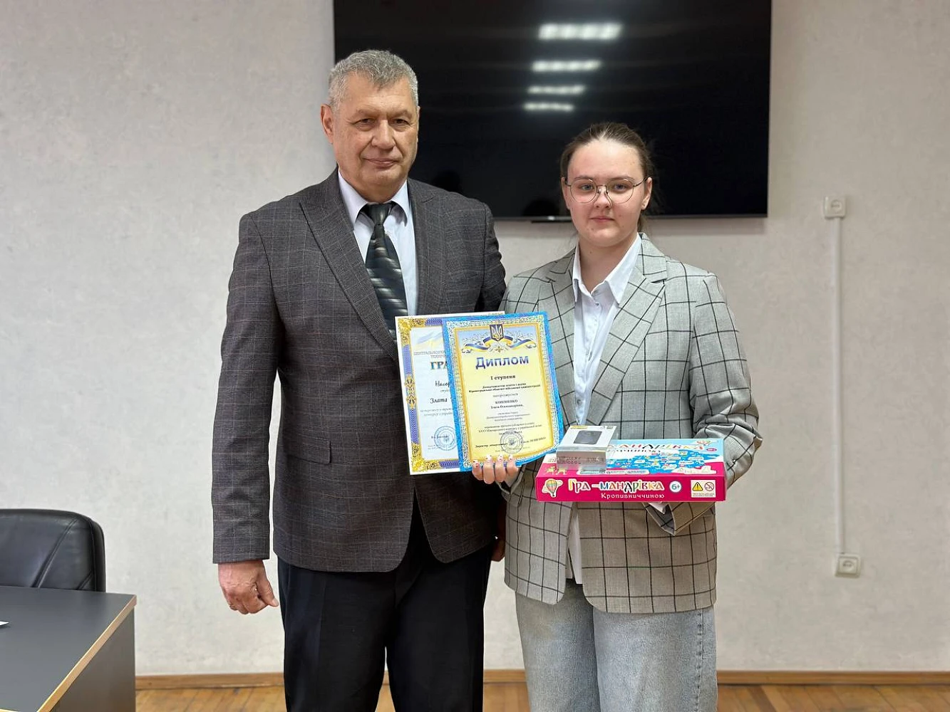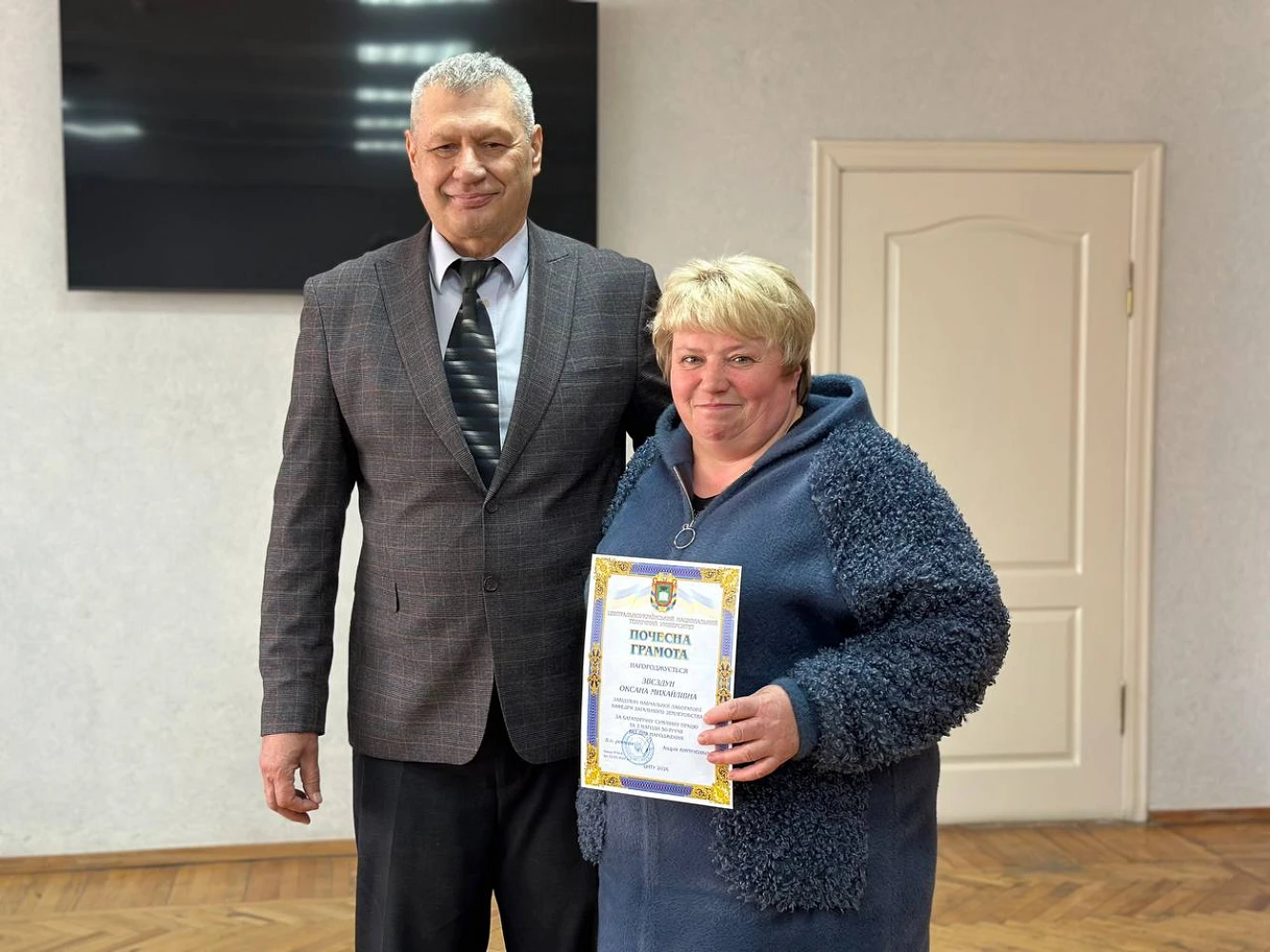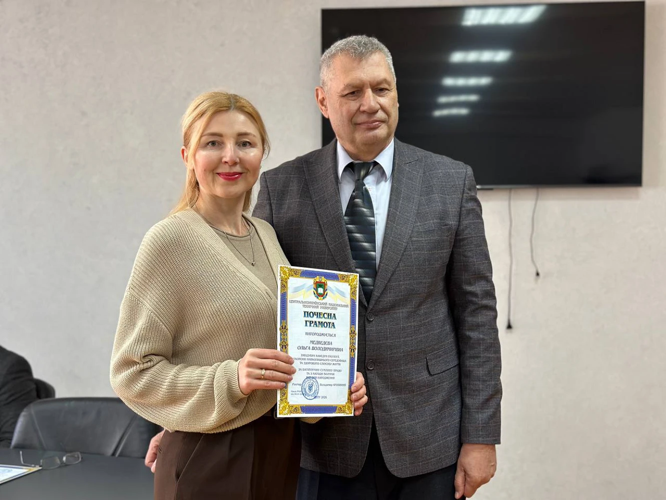 Традиційною частиною засідання стало вручення подяк і відзнак представникам університетської спільноти. Почесними грамотами Центральноукраїнського національного технічного університету нагороджено Сергія Осадчого, Ольгу Медведєву, Олександра Дрєєва, Оксану Звєздун та Анатолія Орловича. Окремо відзначено студентку першого курсу кафедри економіки, підприємництва та готельно-ресторанної справи, яка стала переможницею обласного етапу XXVI Міжнародного конкурсу з української мови імені Петра Яцика. За цей результат її нагороджено дипломом І ступеня Департаменту освіти і науки Кіровоградської обласної військової адміністрації та грамотою ЦНТУ.